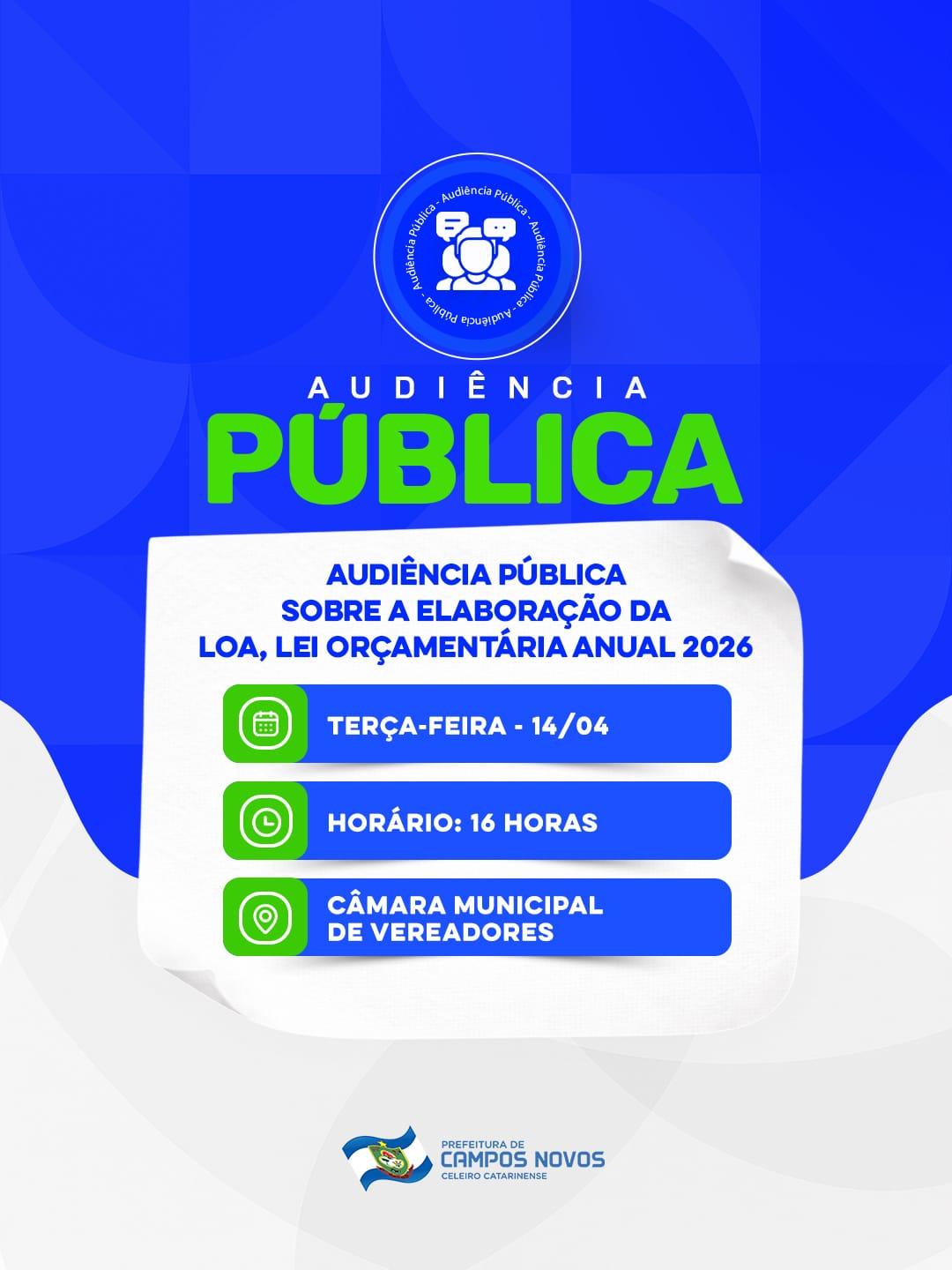 A construção do futuro de Campos Novos passa pela participação da comunidade. Pensando nisso, a Prefeitura convida toda a população para participar da audiência pública que irá discutir a elaboração da Lei Orçamentária Anual (LOA) para o ano de 2026.