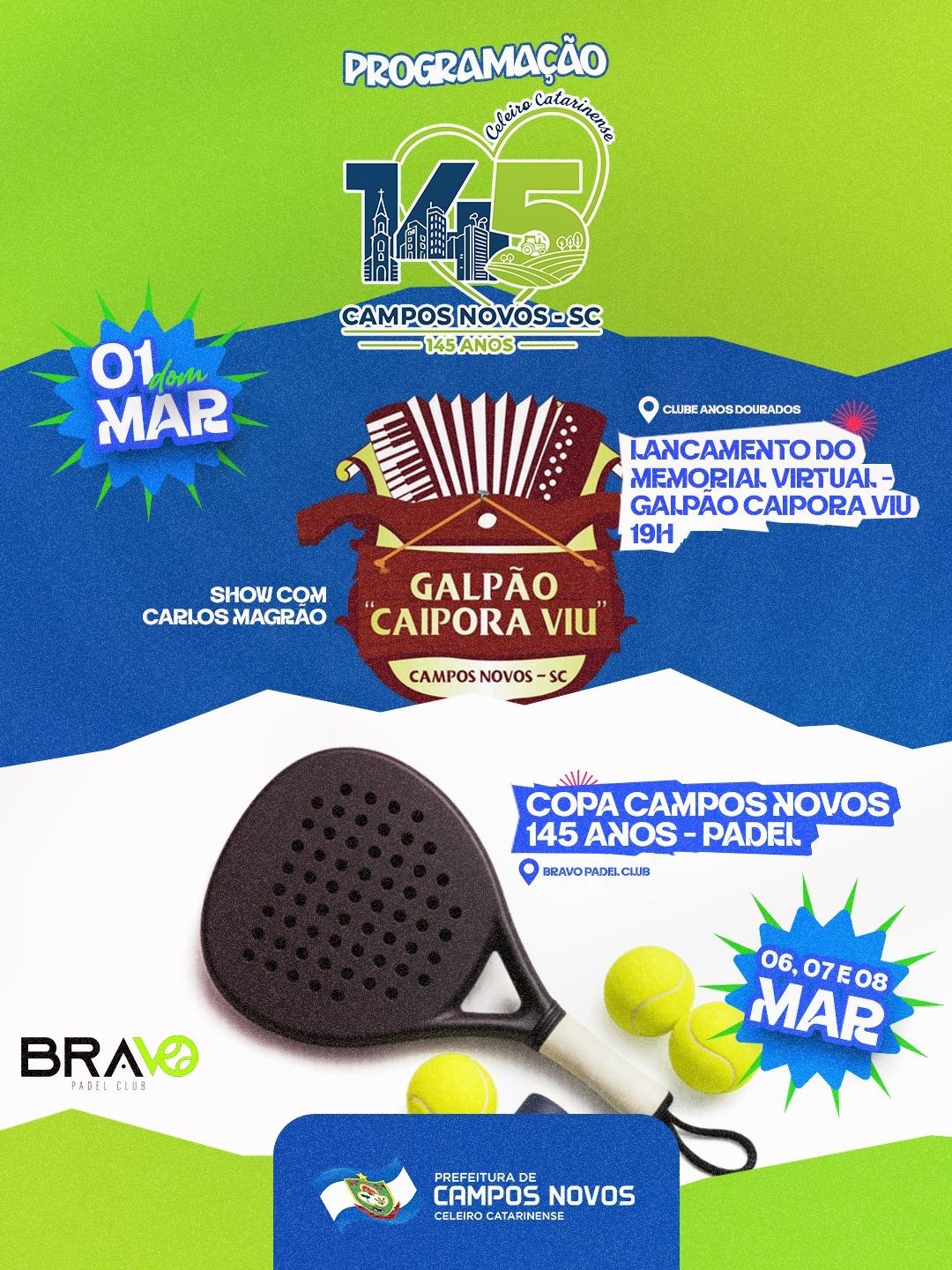 A Administração Municipal de Campos Novos convida a comunidade para participar das comemorações pelos 145 anos de emancipação do município. A programação, que ocorre entre os dias 6 e 8 de março, reúne atividades esportivas, culturais e de integração para celebrar a história e o desenvolvimento da cidade.