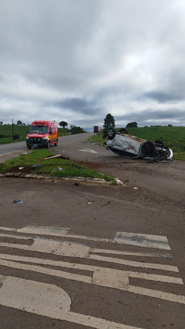 Conforme informações repassadas pelos bombeiros, a colisão envolveu um veículo GM Onix branco e um caminhão Mercedes-Benz. Com o impacto, o automóvel acabou capotando às margens da rodovia.