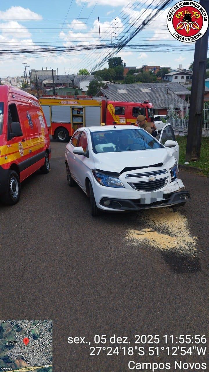 O Corpo de Bombeiros Militar atendeu, por volta das 11h40 desta sexta-feira (05), uma colisão frontal envolvendo dois veículos na rua Antônio Zortea Primo, no bairro Jardim Bela Vista, em Campos Novos (SC).