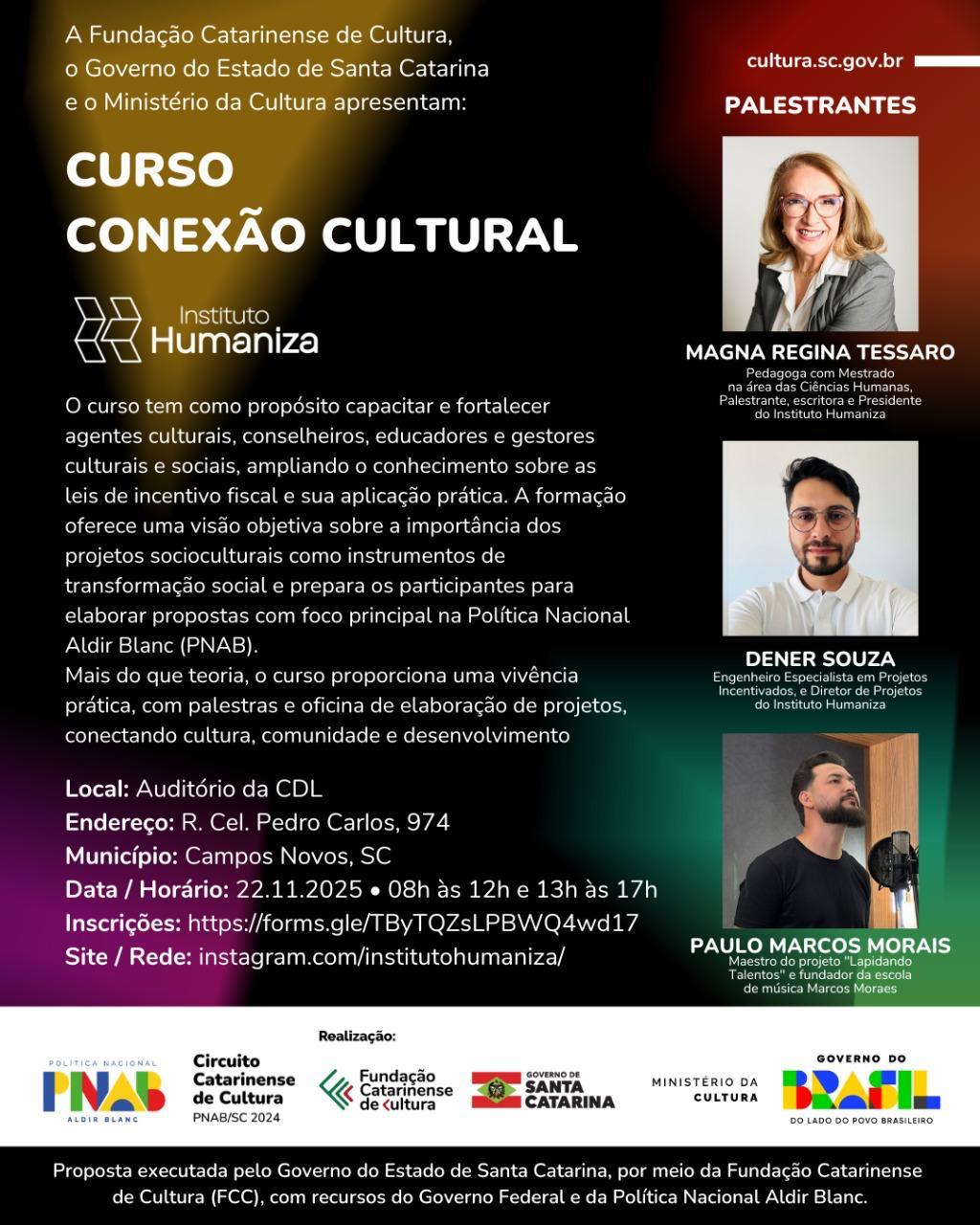 No dia 22 de novembro de 2025, o município de Campos Novos receberá o curso “Conexão Cultural – Formação em Elaboração de Projetos Socioculturais via Leis de Incentivo”, uma iniciativa do Instituto Humaniza, com apoio da Fundação Catarinense de Cultura.