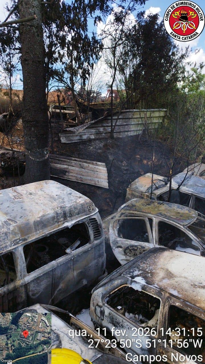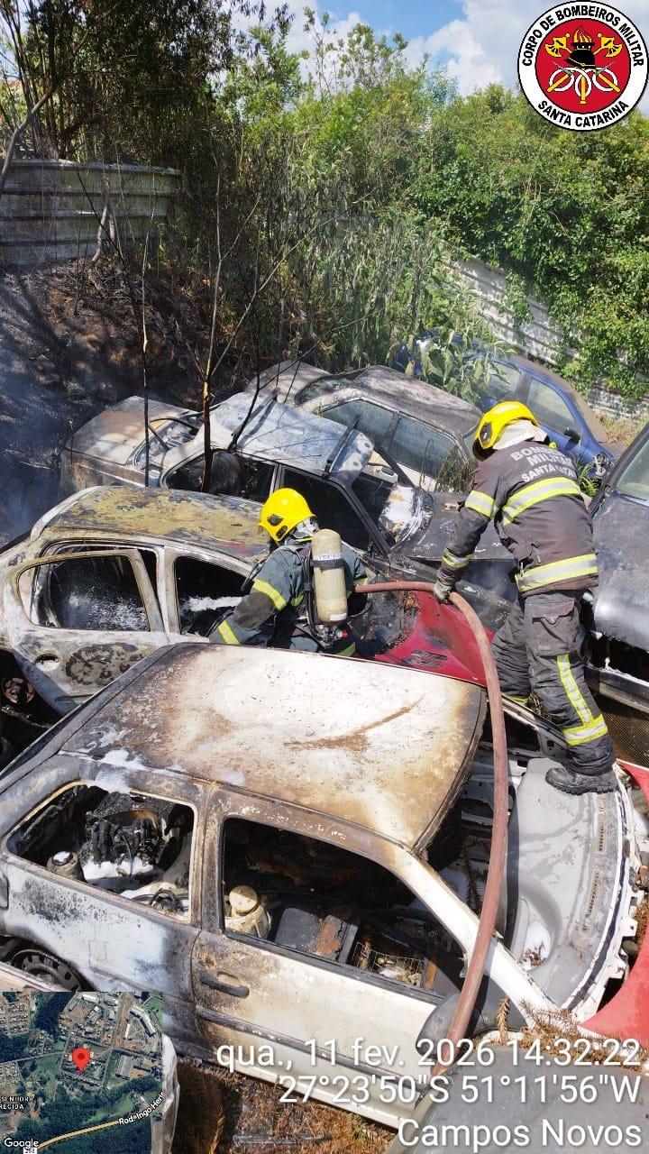 No local, as guarnições do Corpo de Bombeiros constataram que o fogo atingia um depósito de carros velhos, onde aproximadamente sete carcaças estavam em chamas.