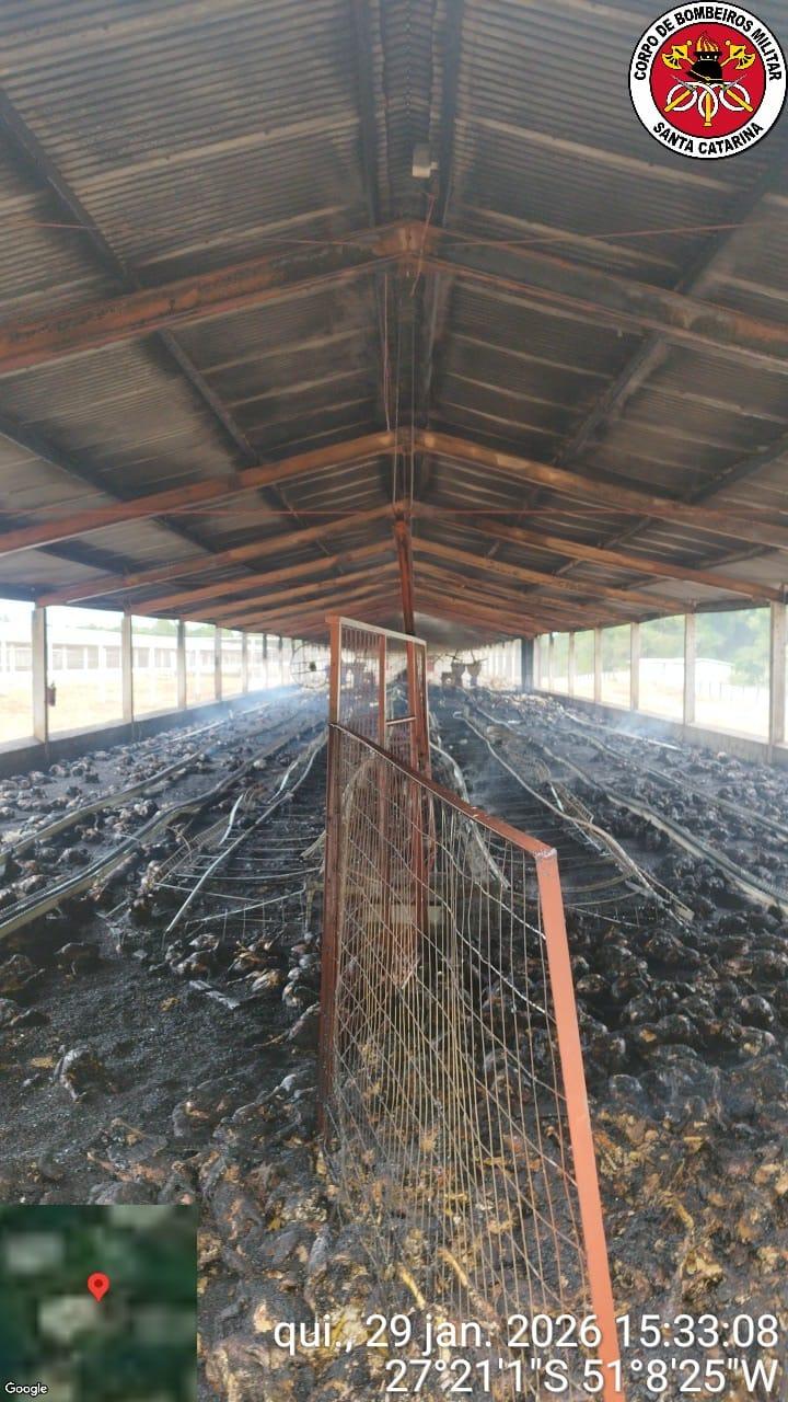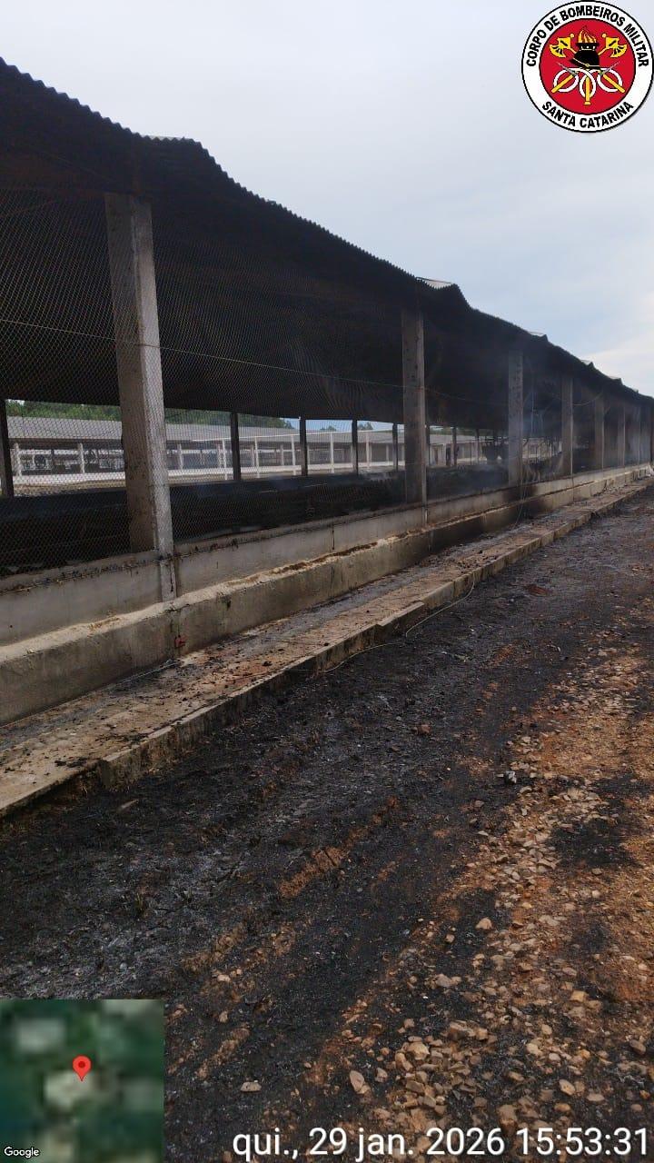 De acordo com informações repassadas pelo Corpo de Bombeiros de Campos Novos, o incêndio alcançou uma área aproximada de 750 metros quadrados, provocando danos estruturais significativos, com a destruição das travessas e das tesouras de madeira do telhado da edificação. Além dos prejuízos materiais, cerca de 7.000 aves morreram em decorrência das chamas.