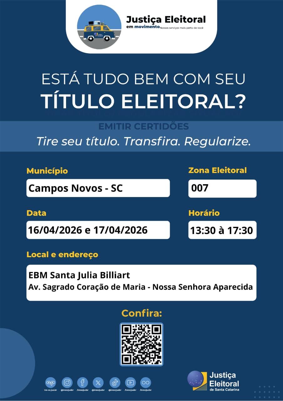 A Justiça Eleitoral de Santa Catarina realiza, em Campos Novos, mais uma edição da ação “Justiça Eleitoral em Movimento”, que tem como objetivo aproximar os serviços do cartório eleitoral da população.