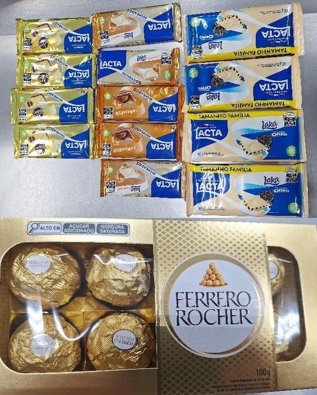 Ao chegar ao local, a guarnição da 3ª Companhia de Polícia Militar abordou a suspeita e encontrou em sua posse 13 barras de chocolate da marca Lacta e uma caixa de chocolates Ferrero Rocher.