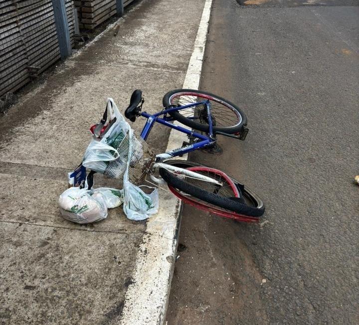 Conforme informações repassadas à guarnição, um veículo que transitava pela via colidiu inicialmente contra um automóvel estacionado à margem da rua e, em seguida, acabou atropelando uma mulher que caminhava pelo local empurrando uma bicicleta.
