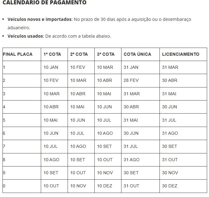 Os proprietários de veículos poderão escolher entre três modalidades para quitar o IPVA em 2026. A cota única deve ser paga até o fim do mês correspondente ao final da placa — no caso das placas terminadas em 1, o prazo vai até 31 de janeiro. Também será possível parcelar em três vezes sem juros, com a primeira parcela vencendo no dia 10 do mês correspondente à placa. Há ainda a opção de parcelamento em até 12 vezes no cartão de crédito, por meio de empresas credenciadas, com incidência de encargos financeiros.